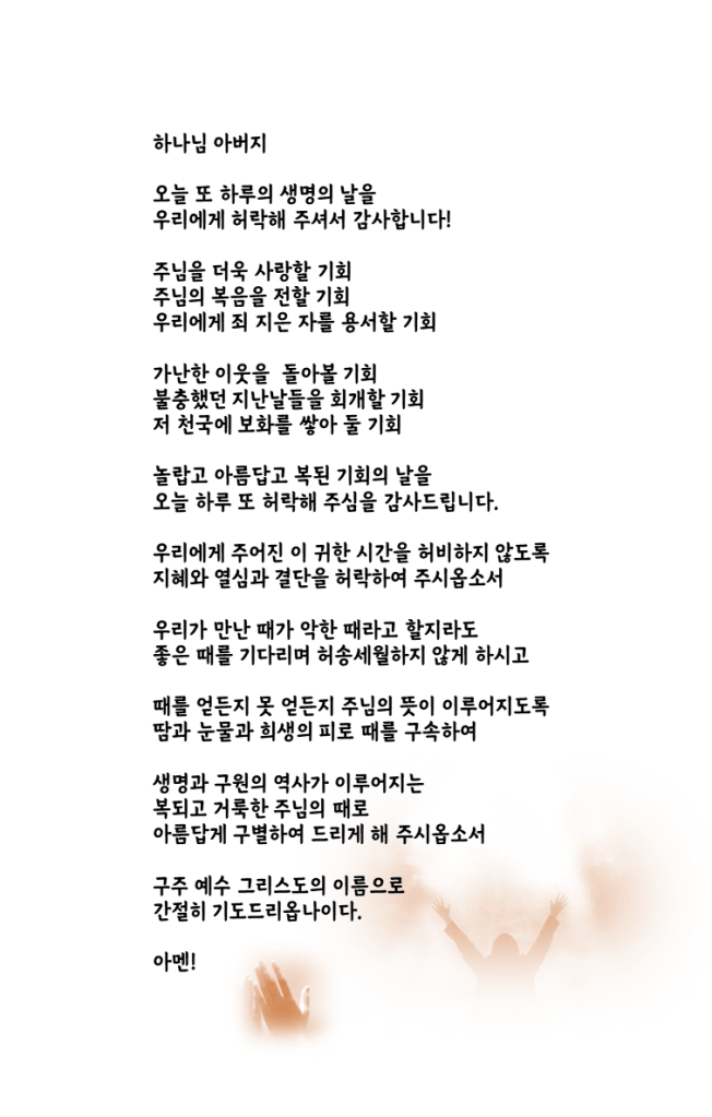 오늘의 기도 이미지 2025년 4월 2일2026년 3월 6일missionkr 이 글 공유하기: X에 공유 (새 창에서 열림) X Facebook으로 공유하기 (새 창에서 열림) Facebook 좋아하기 가져오는 중...